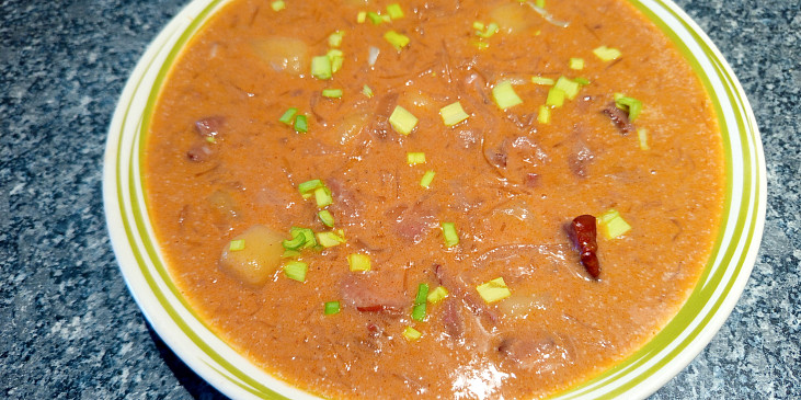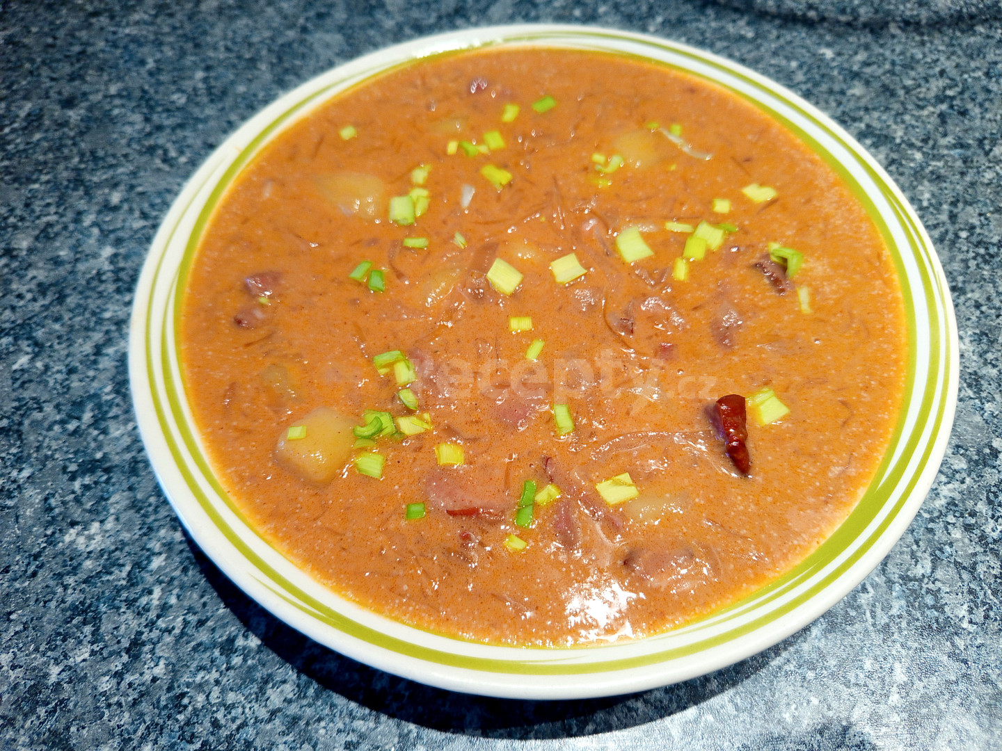 žebra uzená, brambory, klobása papriková, zelí kysané, cibule, paprika sušená sladká, smetana sladká, sádlo, mouka hladká, sůl, česnek, smetana zakysaná, pažitka