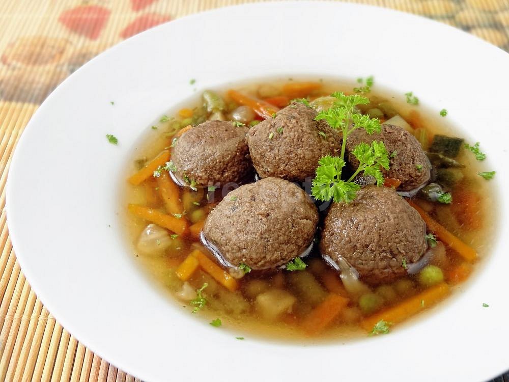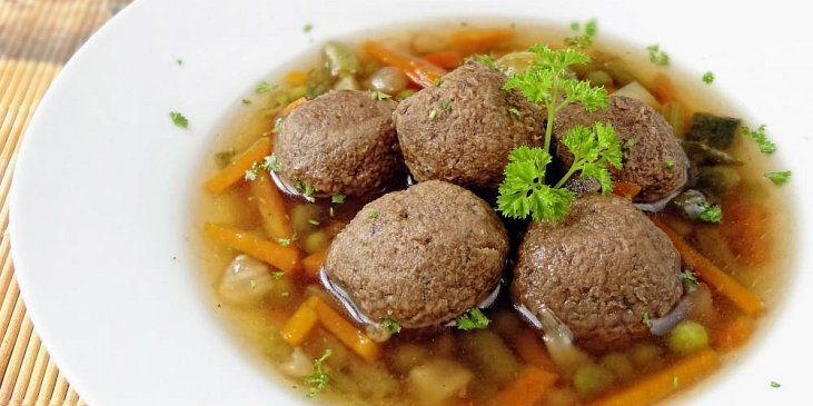 přední hovězí, cibule, polévková zelenina, česnek, bobkový list, pepř celý, koření nové koření, sůl, pepř mletý, játra kuřecí, máslo, vejce, česnek, cibule, petrželka, majoránka, květ muškátový, strouhanka, sůl, pepř mletý