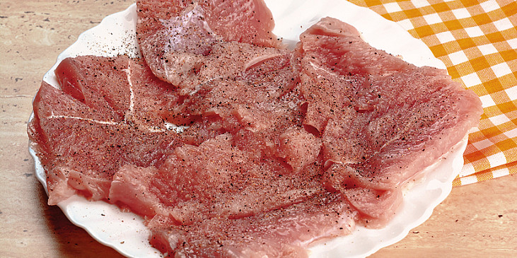 prsní řízek, olej, cibule, párky vídeňské, mouka hladká, vývar drůbeží, hořčice plnotučná, okurky sterilované, vejce, sůl, pepř mletý, řeřicha
